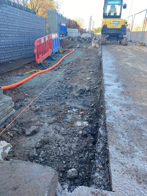 Serfis Construction and engineering were involved in the vacuum excavation behind the structure to allow the Network Rail team to carry out the repairs to the bridge adjacent which was required due to the number of live services below the footpath level. We returned to site suppling and installing the kerbing requirements to support the footpath and section of carriage way renewal followed by tarmac installation and road lining.