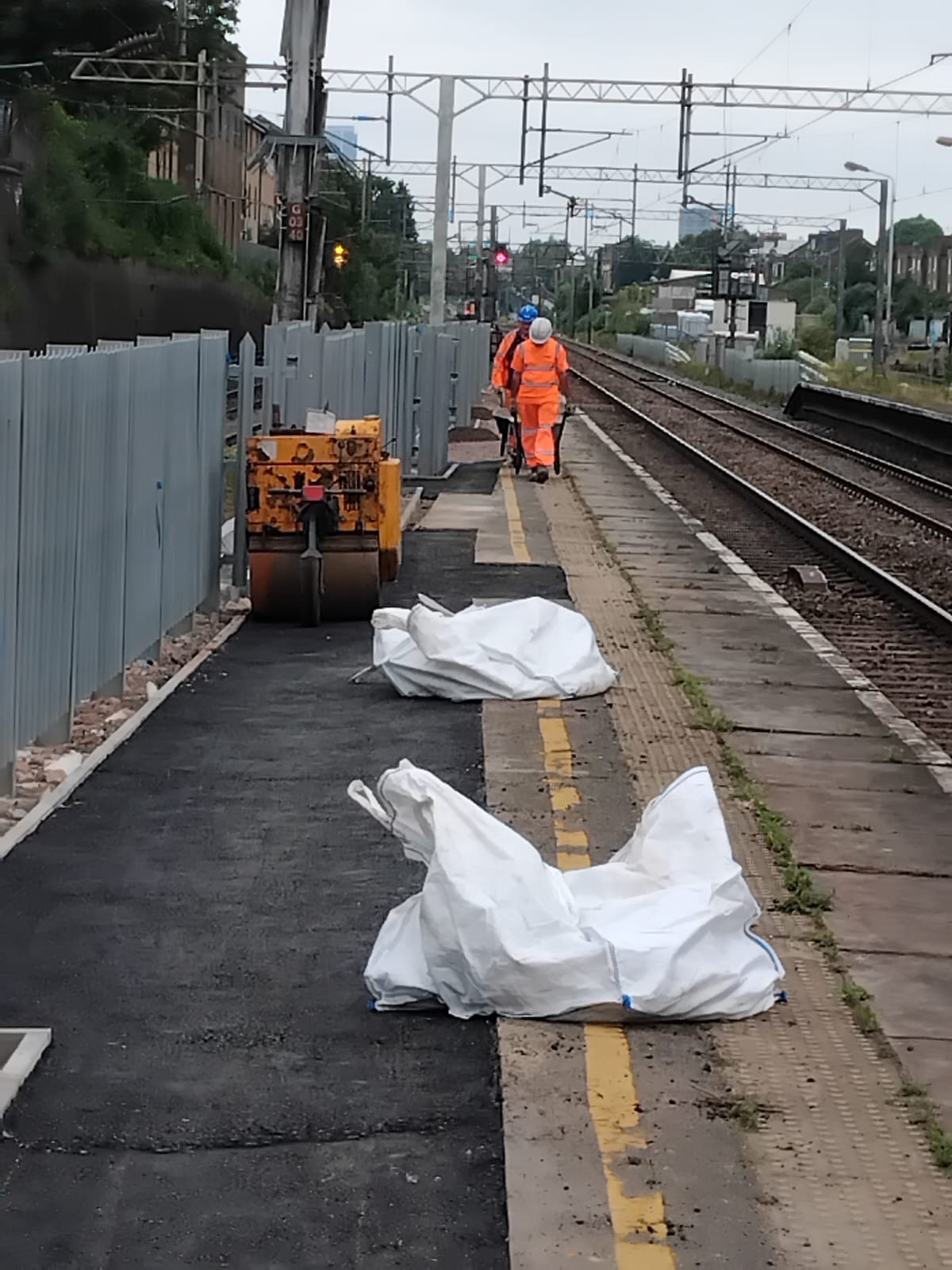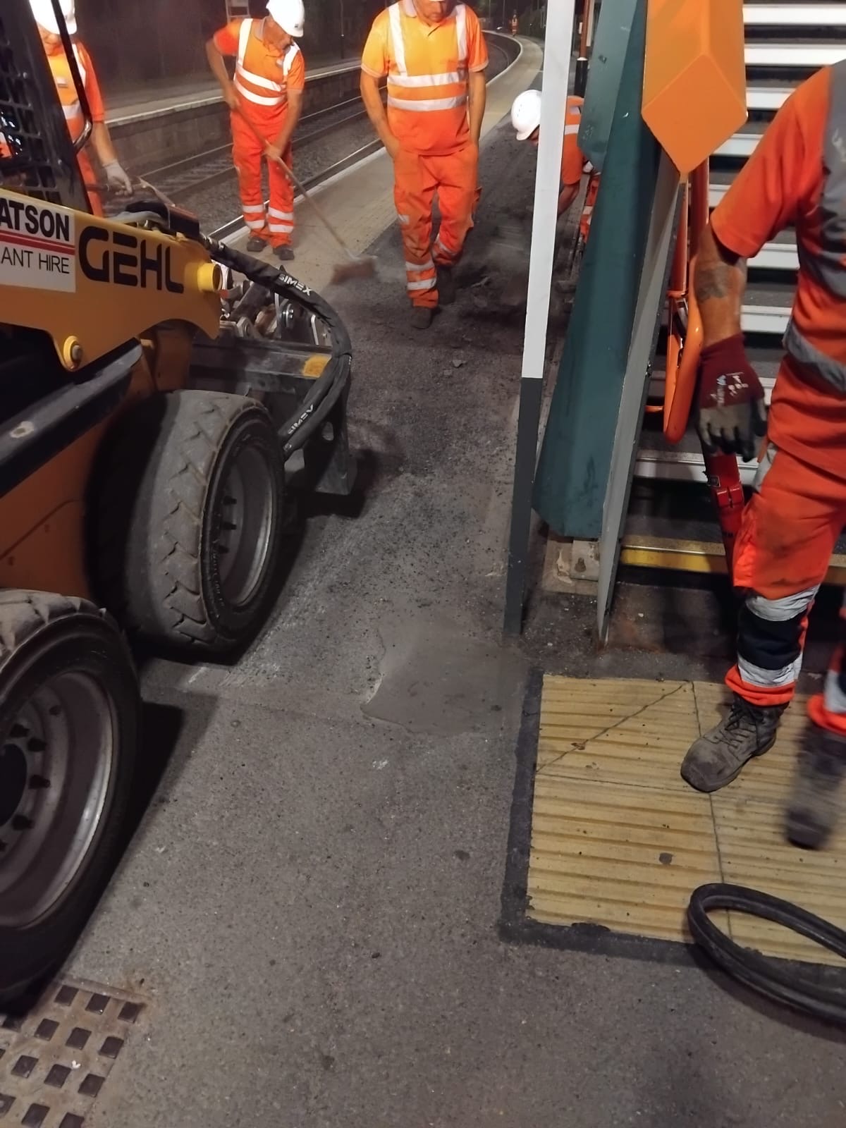 Paving installation including tactile paving to platforms.